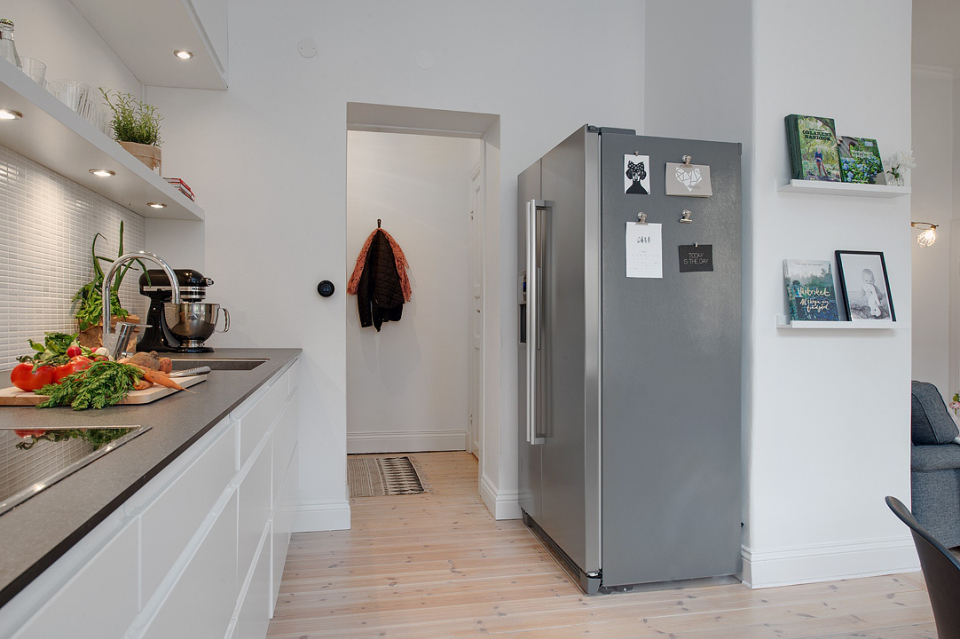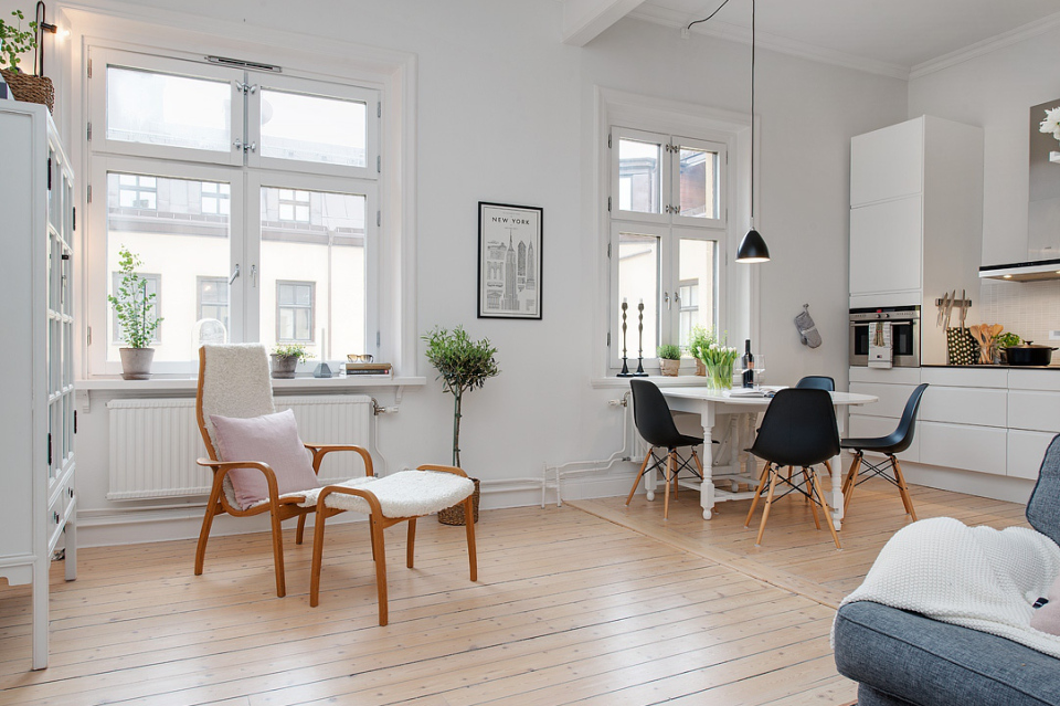 Un ambiente claro, en tonos blancos que reflejan la luz de las paredes en el mismo tono y muebles muy nórdicos y minimalistas son las normas de rigor en este apartamento.